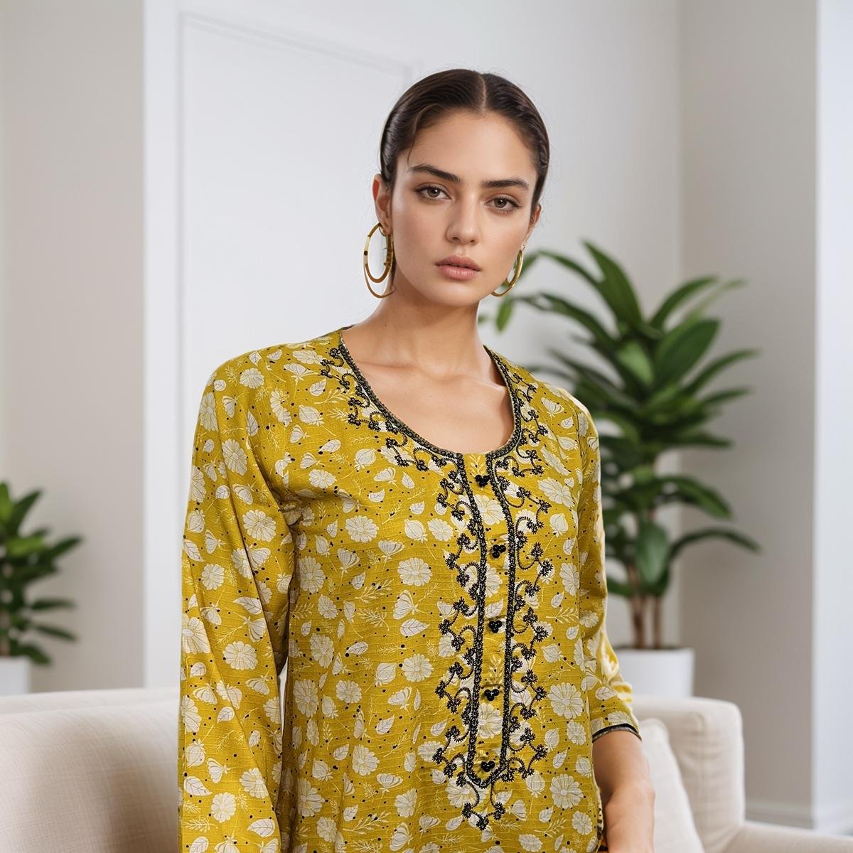 Whether you’re dressing up for a gathering or just want a chic look for everyday wear, this Kurti combines comfort and style. It’s perfect for pairing with leggings or trousers and offers both elegance and ease.