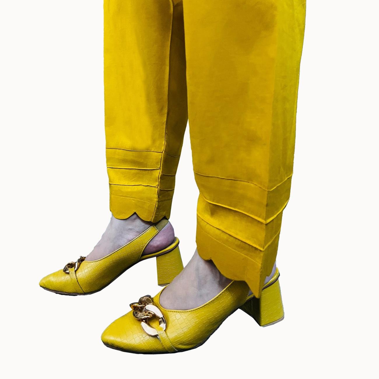Discover comfort and style in our Mustard Solid Color trousers. These pants boast delicate cutwork at the hem, adding a touch of elegance. The palette work forms a charming pattern. With a simple design, these trousers suit any occasion. The elastic waist ensures comfy wear all day. Elevate your fashion with these essential trousers that effortlessly combine comfort and class