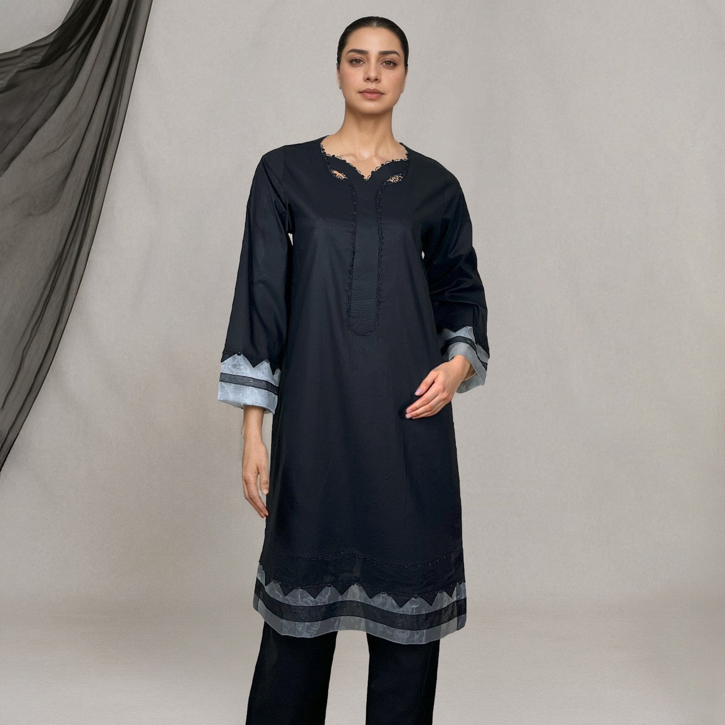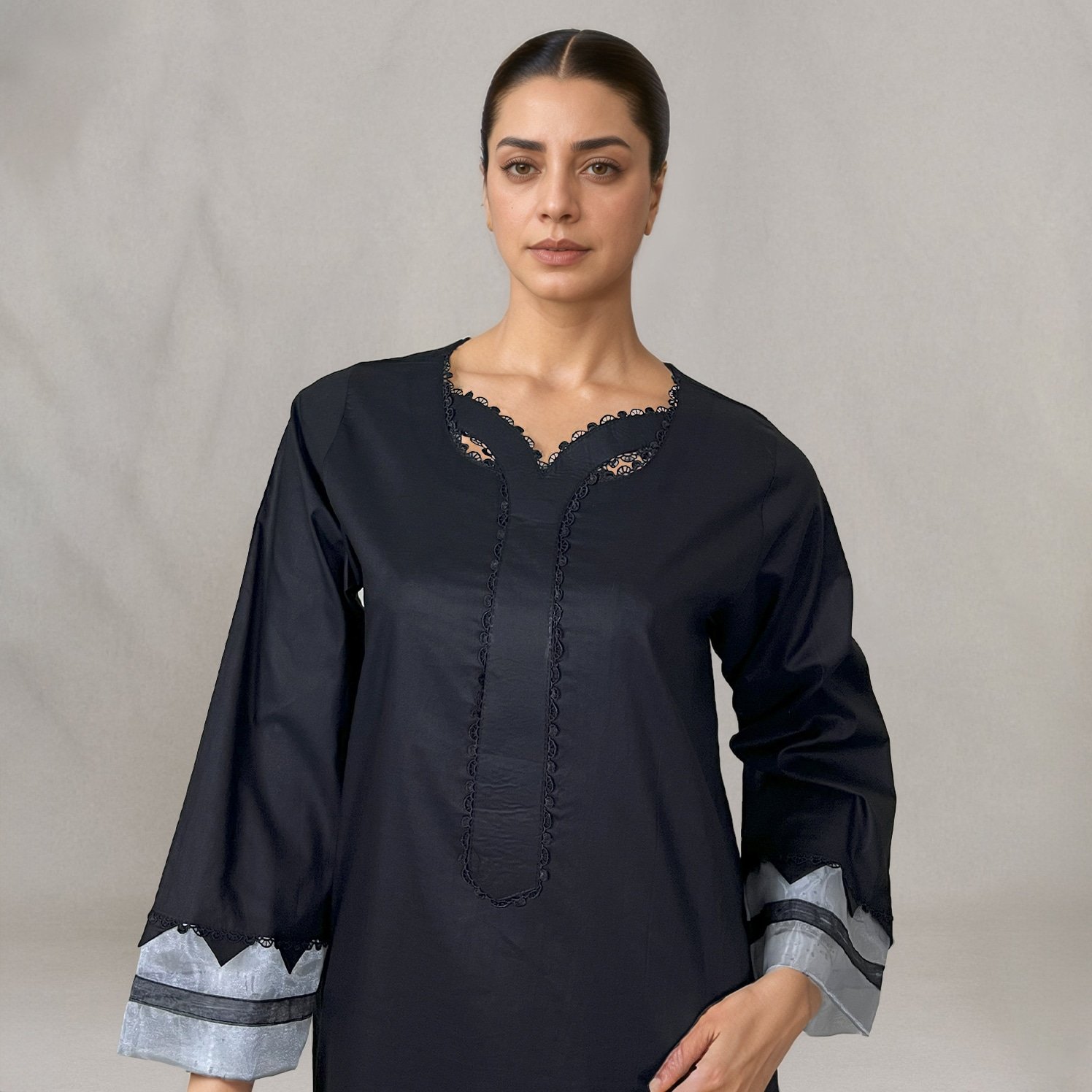 Layered lacework at the hem and cuffs adds just the right touch of depth to a plain base. Light yet structured, the fabric drapes cleanly and breathes well through the day.