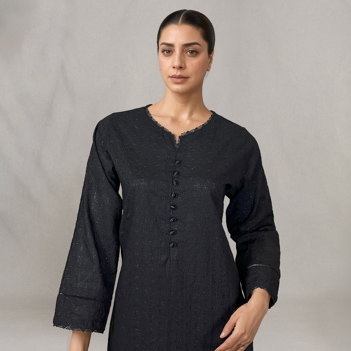 Sitam carries quiet power — a long chikankari kurti embroidered from shoulder to hem in a refined grid. Made for moments of presence, it balances intricate craft with clear form.