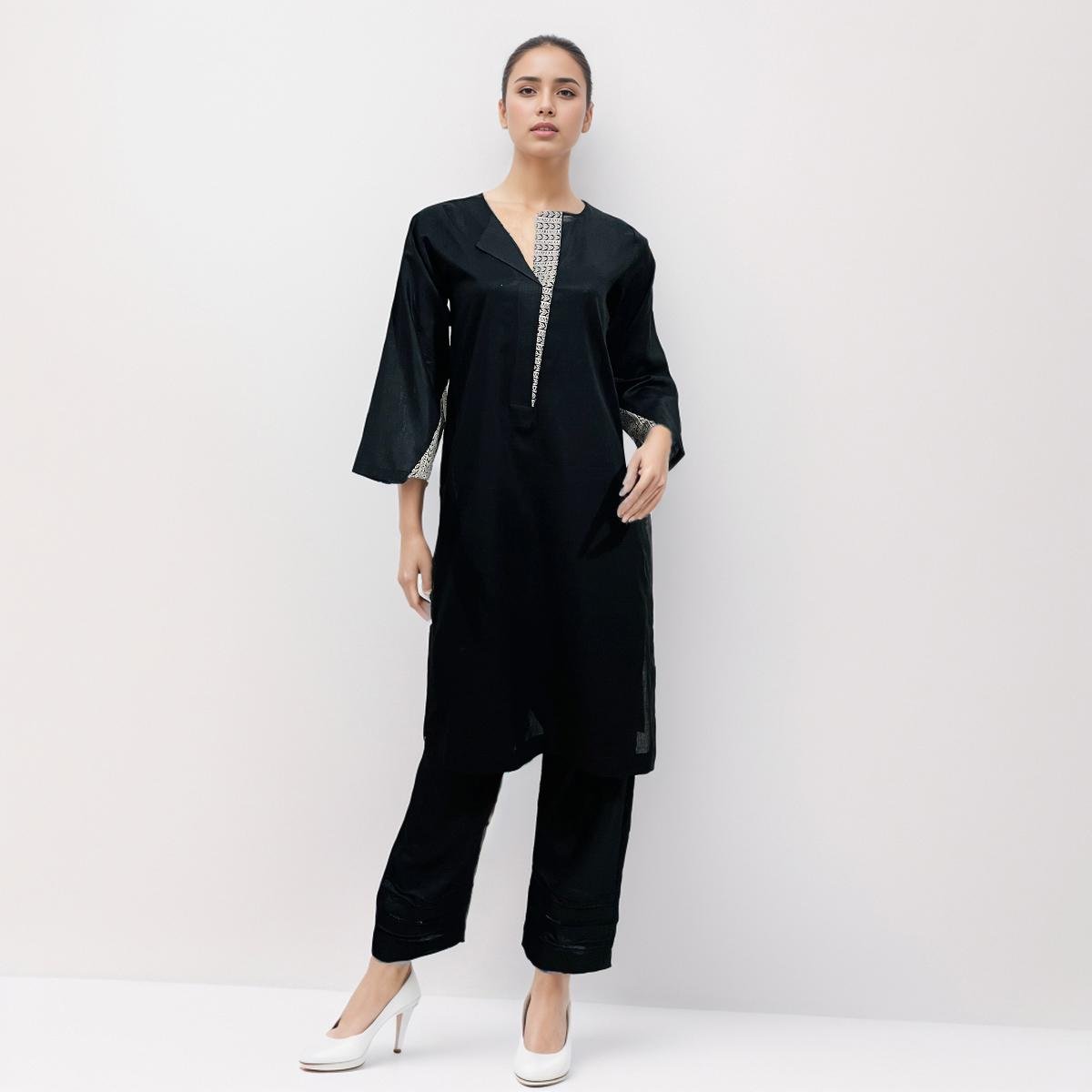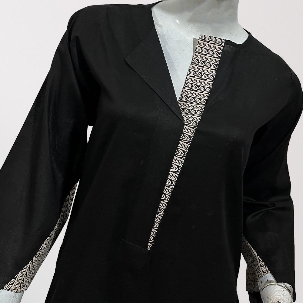 Sanaa Straight Cut Kurti for Women blends classic appeal with contemporary detailing. Crafted in high-quality lawn and also available in winter fabric, it offers comfort across seasons. The kurti features a sleek silhouette in timeless black, elevated by contrast fabric accents on the neckline and sleeves for a refined, modern touch.