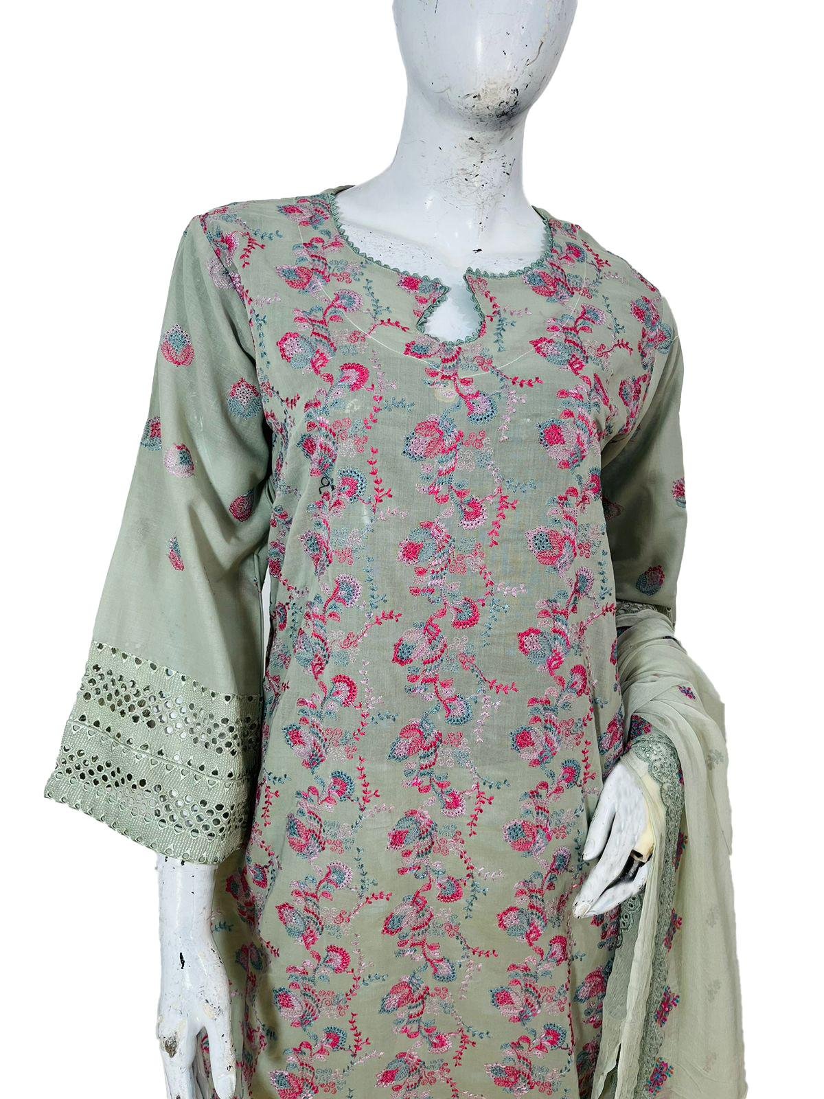 Whether you’re heading to a wedding, a party, or just want to make a statement, this Thistle Green Chikankari Embroidered 3pc Stitch Suit is sure to impress!